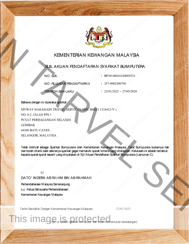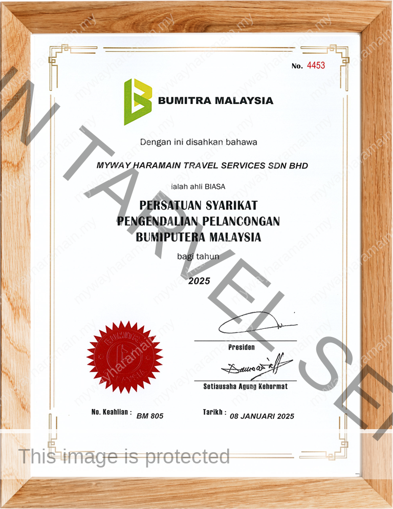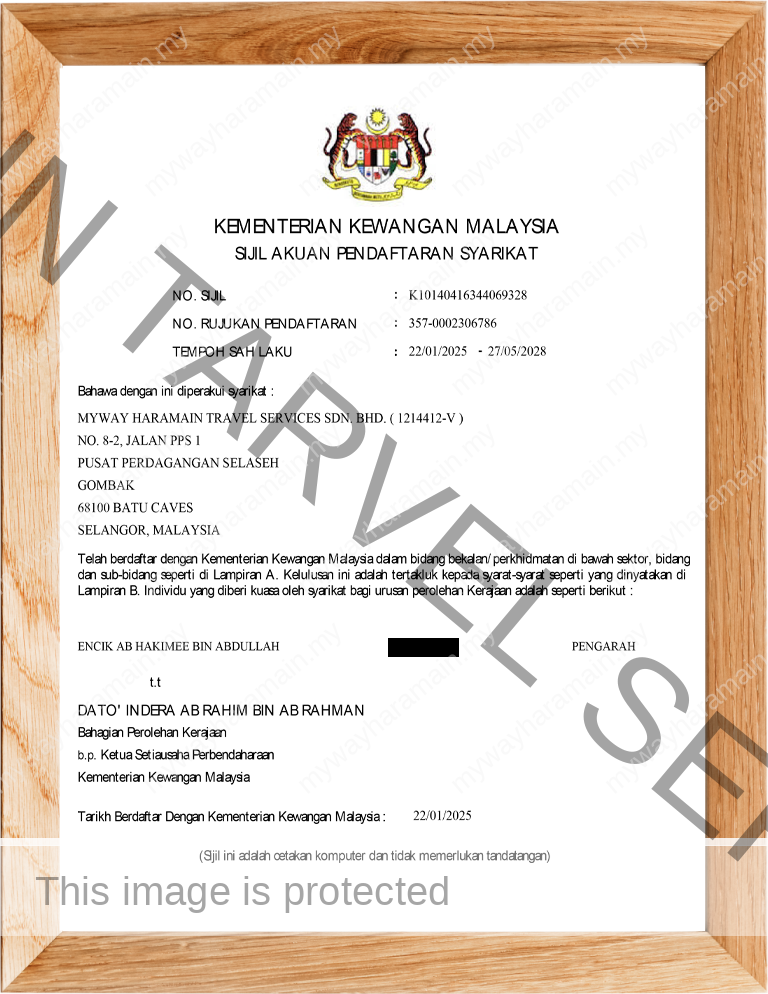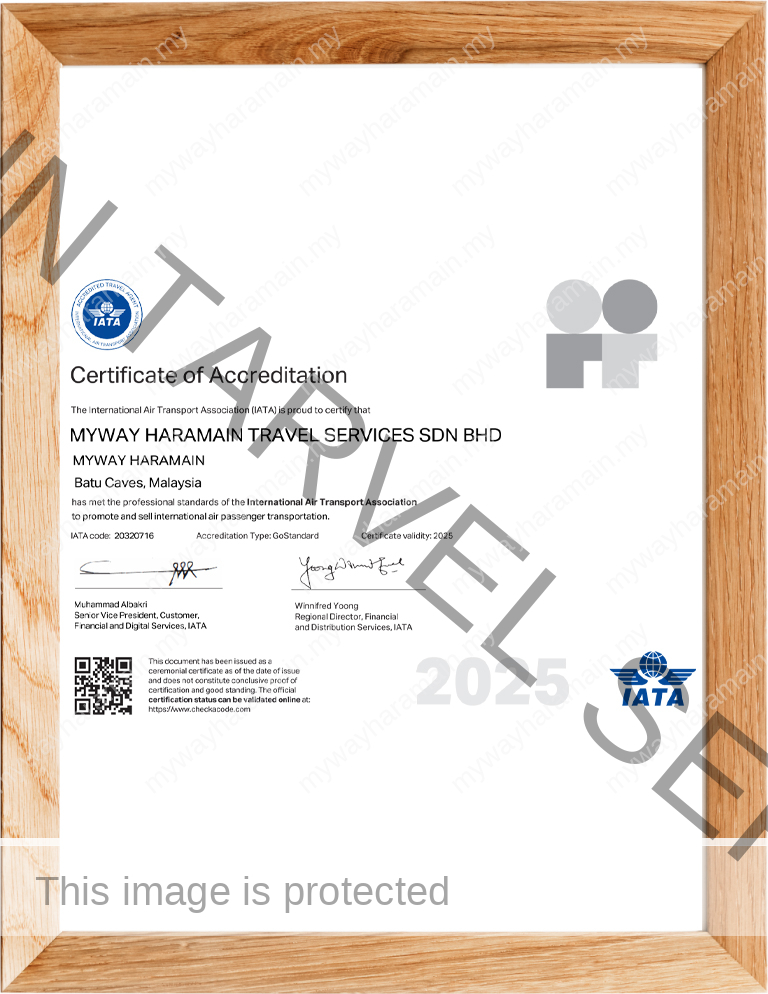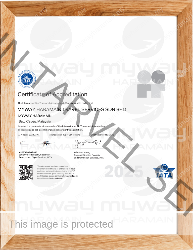 Myway Haramain Travel Services Sdn Bhd telah diiktiraf dan didaftarkan di bawah Kementerain Pelancongan, Seni Dan Budaya Malaysia (KPK/LN: 8631), berdaftar dengan Kementerian Kewangan Malaysia dan menjadi ahli kepada Persatuan Agensi Pelancongan Bumiputera Malaysia atau BUMITRA (No Ahli : 805), ahli kepada Persatuan Agensi Pelancongan Umrah & Haji atau PAPUH dan Persatuan Pengangkutan Udara Antarabangsa atau IATA (No Ahli : 20320716).